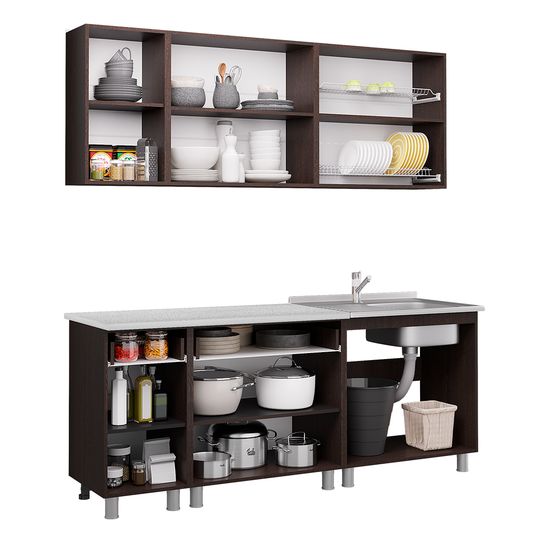 В стоимость входит столешница АНТАРЕС шириной 400 и 800мм, толщиной 26 мм. Модуль под раковину столешницей не комплектуется.