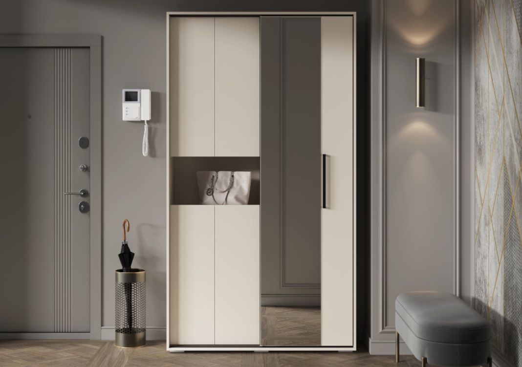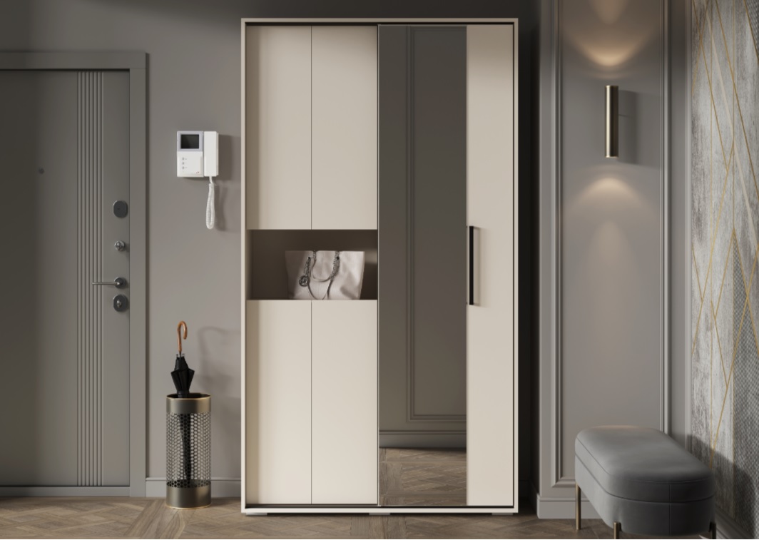 - Разделение на секции: Одна часть прихожей включает две одинаковые секции с полками, закрытые створками. В каждой секции предусмотрено по две съёмные полки, что позволяет настраивать пространство под ваши нужды. Открывание створок осуществляется за выступ, что делает использование шкафа более удобным.